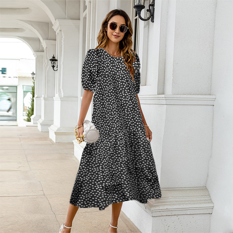 夏裝2025女式休閒短袖黃色圓點印花寬鬆蓬裙泡泡袖沙灘裙